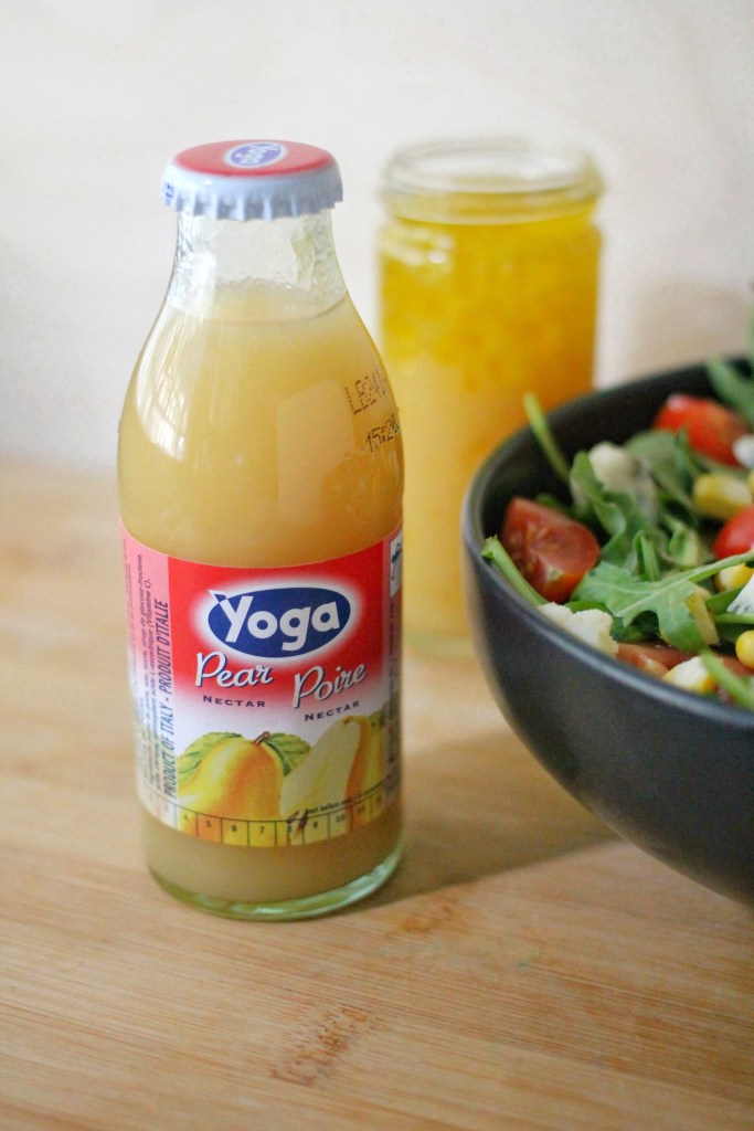 Recently, I was gifted a collection of fruit juices and nectars made in Italy, namely Yoga Pear Nectar, along with some vinaigrette recipes to make with them. I love slightly fruity dressings for my salads – I’m always one to add ample lemon to my vinaigrettes! – but the idea of adding pear nectar never crossed my mind. Pear is one of my favorite fruits, so I jumped at this opportunity. (P.S.: How adorable are these little bottles?) I was told that it pairs well with arugula and bleu cheese, so I took some liberties to create a salad that pretty damn amazing, if I do say so myself!