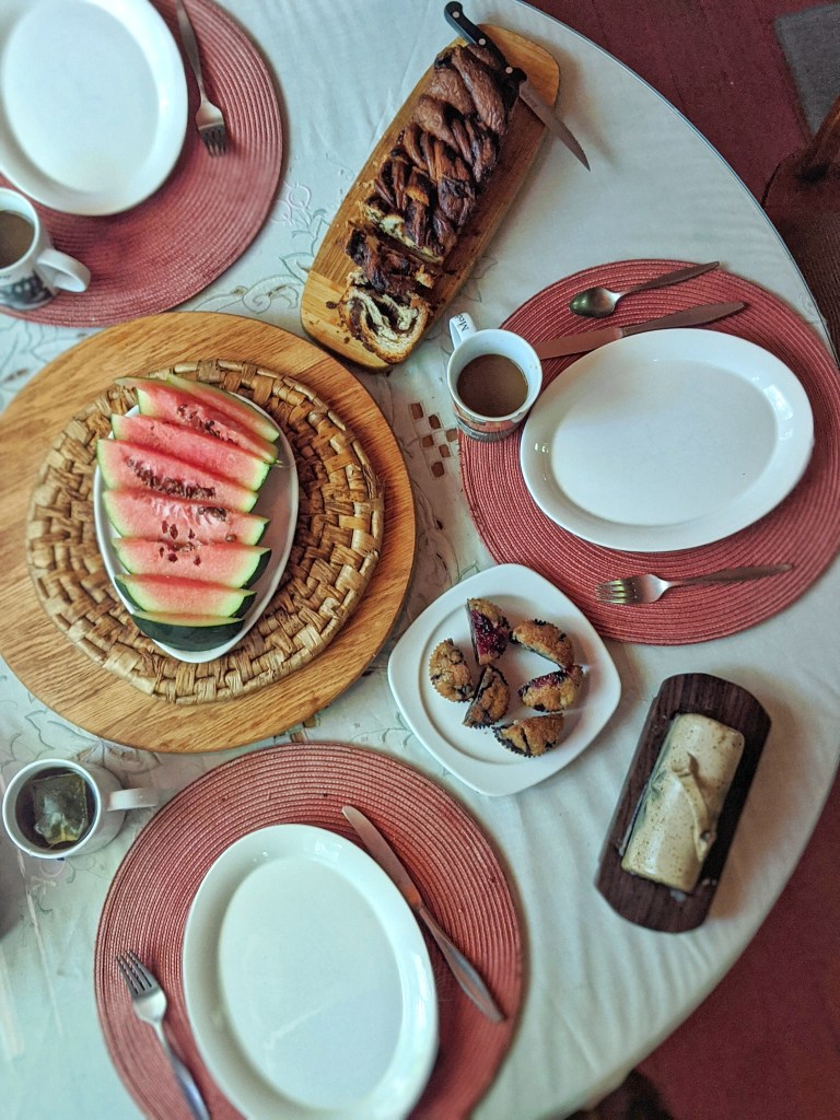 Out of that dozen muffins baked, I’m sure I ate half by myself. One morning, Mama split them, buttered them, and threw them on the griddle to crisp them up a bit. Served alongside of chocolate babka I had brought up from Breads Bakery and a local watermelon from a nearby farm, it was the perfect bit of indulgence for us all.