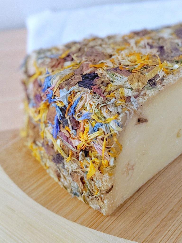 I received three cheeses to try. The Mountain Herbs Rebel from Käserebellen is lactose-free, verified GMO-free, matured in natural rind, and made from mountain farmer’s hay milk TSG, which you can read more about here. Its herbaceous flavor is unbelievable! The Alp Blossom – soft with a stunning coating of marigold, rose petals, lavender, and chervil – has a subtle sweetness yet a strong robust flavor at the same time; this cheese borders on “too pretty to eat!”, but I was able to get over that and enjoy all that cheese had to offer. Finally, I received Moosbacher; if I had to compare it to something you might know, think of a Jarlsberg or a Emmental kind of swiss. Its tang is undeniable, and its smooth texture with its tender bite is always inviting.
