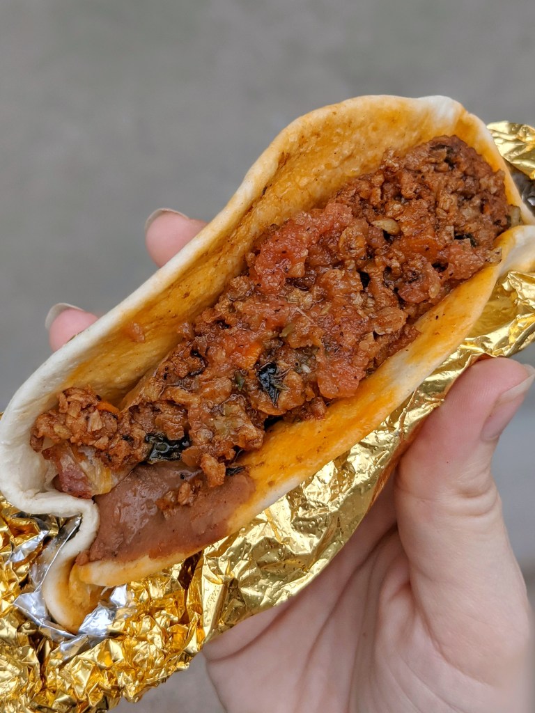 Kevin told me to enjoy the queso on my tacos, and I could make the No. 5 non-vegan by pouring a little on top. My conscience got the best of me, and I only poured my queso on the Or’izo, I just couldn’t sully the Chili Non Carne™ otherwise. (Ha!) But what a delight it was! I might have licked the remaining queso out of its tiny container. (Actually, there is no “might have” about it.)
